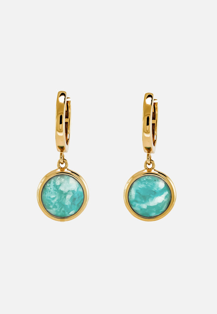 Our newest gemstone, the amazonite, is known as our green goddess for its heart healing powers. The deep green color of the stones remind us of the beautiful and calm waters of the sea. Wear a little bit of summer year round with our Amara huggie hoop earrings!