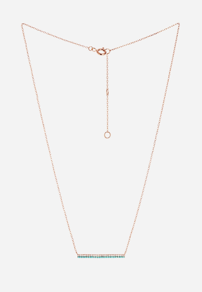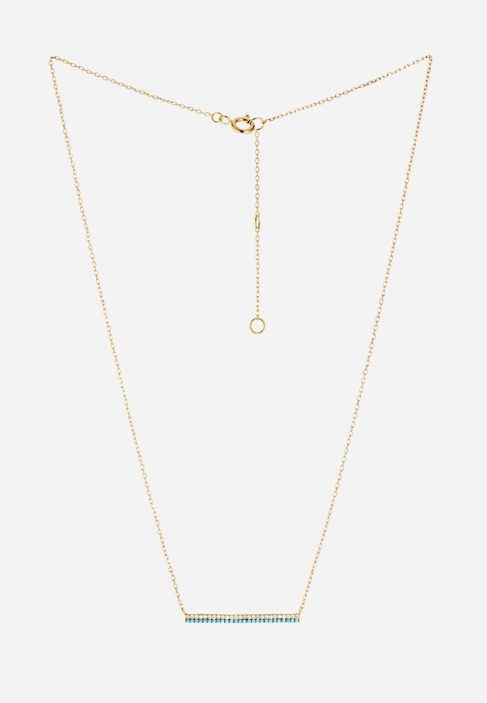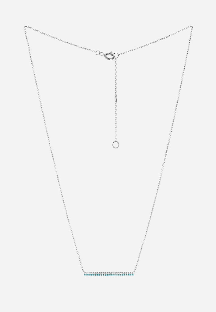 Set with the tiniest, sparkliest stones, this bar necklace elevates any ensemble. One row of crystal clear cubic zirconia stones is accented with robin's egg blue nano stones for a hint of color. Layered on with the rest of your collection, or worn solo, it's sure to catch a few glances.