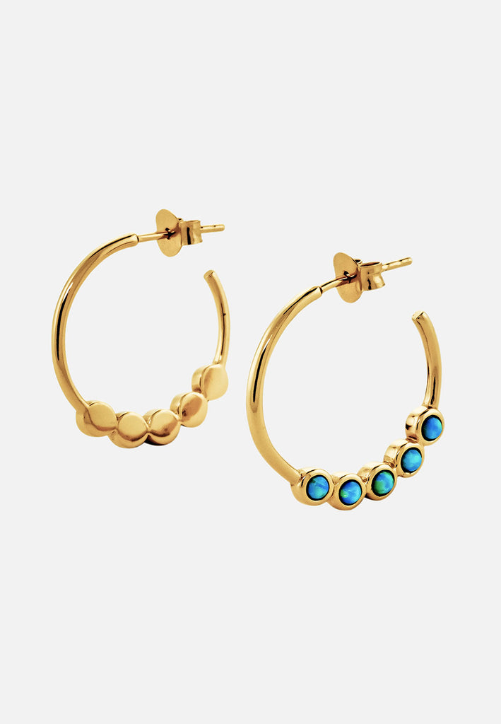 As part of our summer inspired collection, the open styled Bianca half hoops have everything you need to celebrate everything tropical. The earrings have blue fire opal stones set in the bottom for an easy, breezy look that will take you from a beach lounger to a hot night of dancing.
