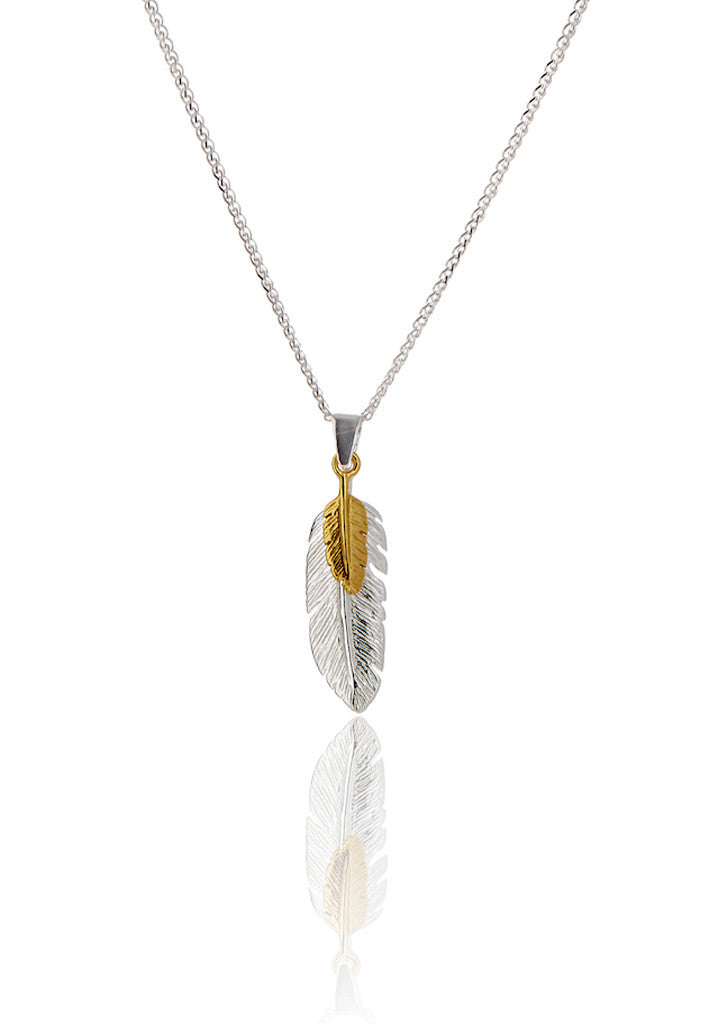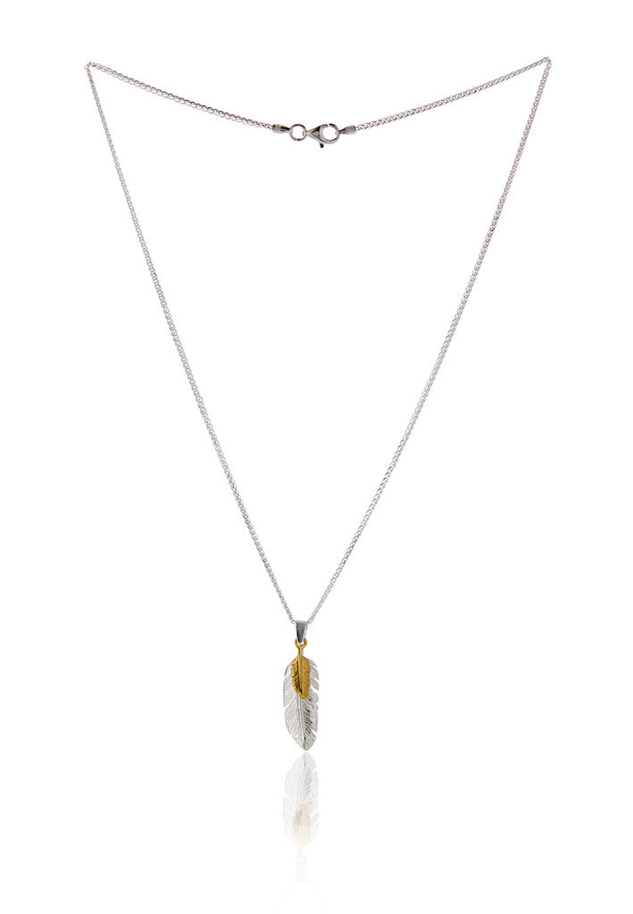 Whimsical with its mix of hues, this feather necklace features two tiny charms in sterling silver and gold vermeil. The matching chain also features gold vermeil and sterling silver finish. Might we suggest pairing this charmer with fringe and lace?