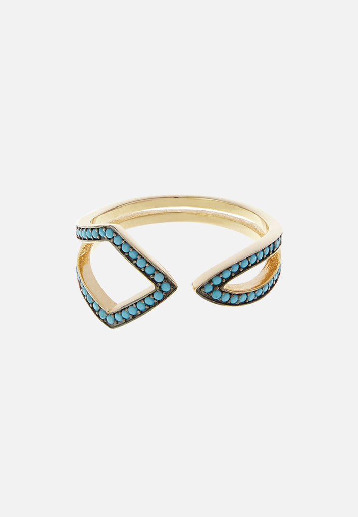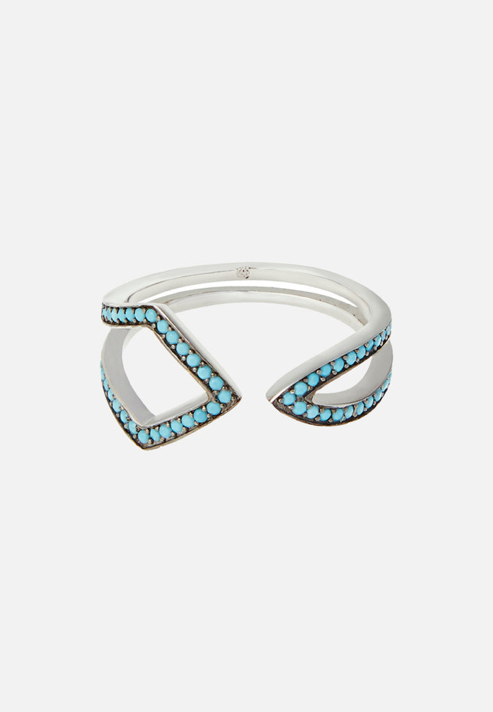 Set with the tiniest blue stones, this asymmetrical cuff ring adds color and sparkle to any ensemble. The open ends are shaped into a diamond and an almond, both studded in turquoise gems. Each faceted stone catches the light, making a statement with every gesture.
