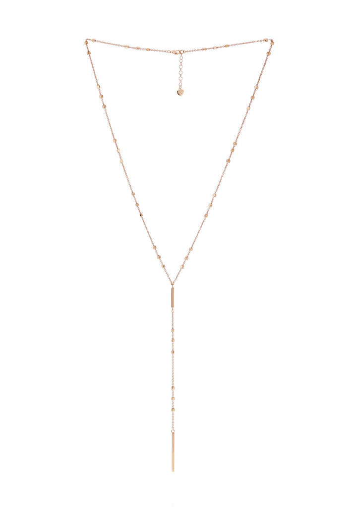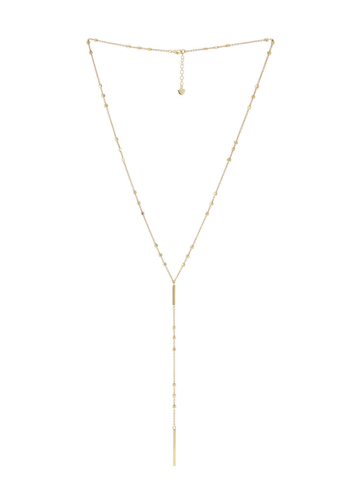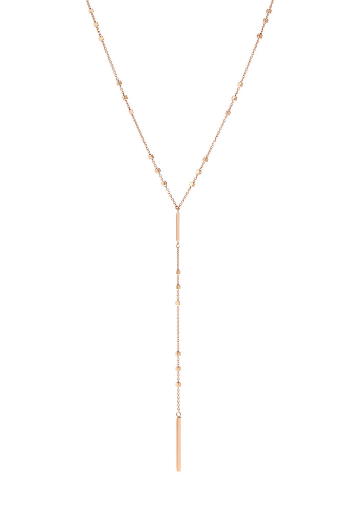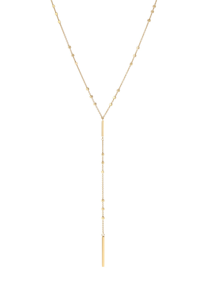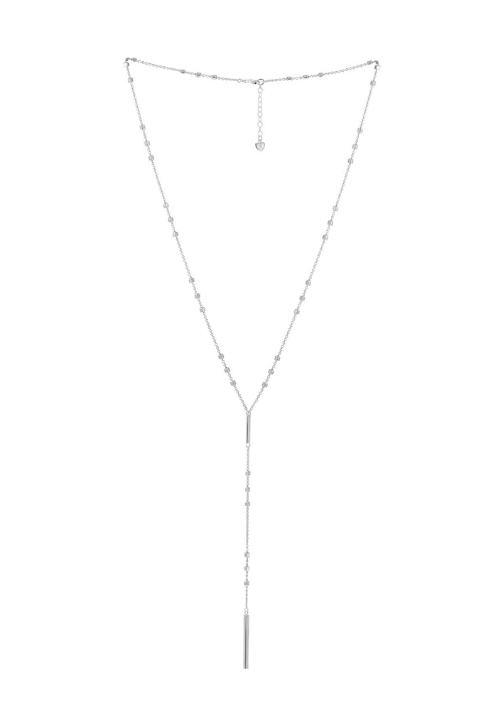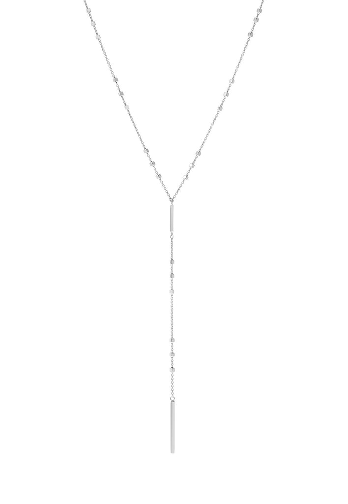 Draping and flattering in all the right places, this lariat necklace features an extra long drop with two bars. The beaded chain is dotted with tiny cubes in groups of three, and the bars are weighted, to hang straight down. Simple, but not at all minimalist.