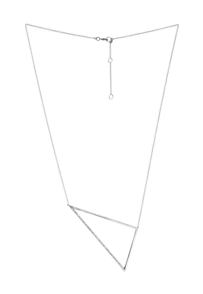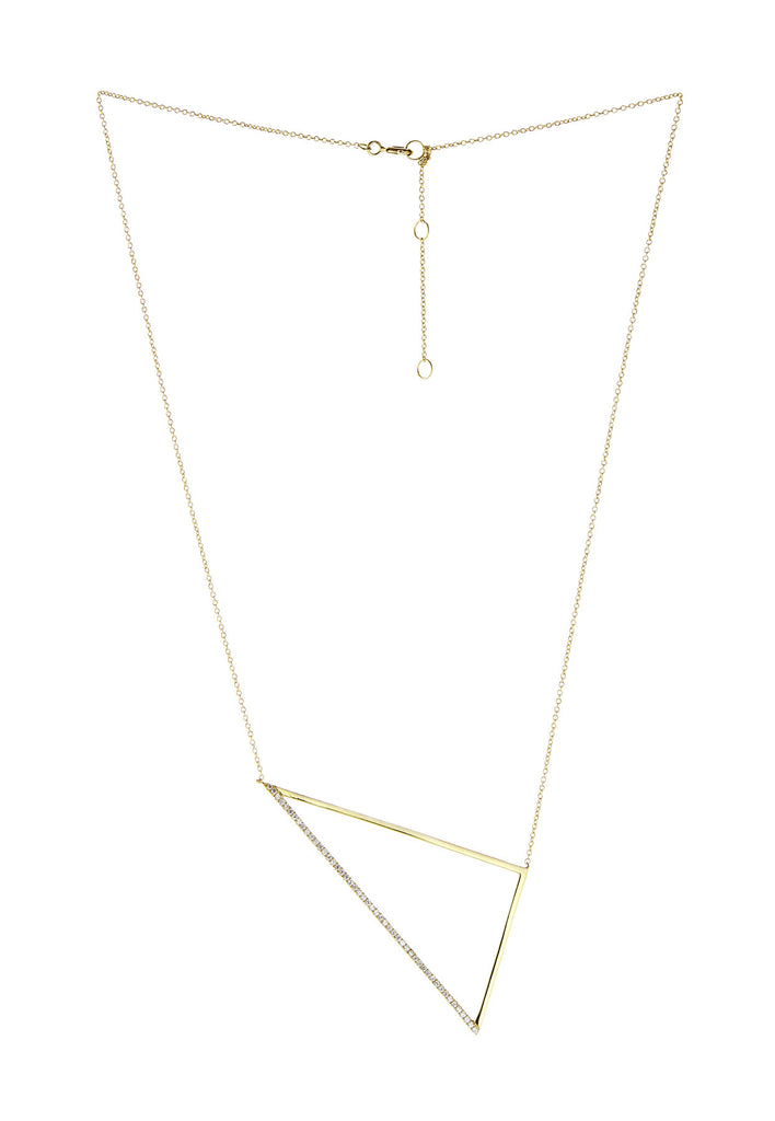 Bedazzled with tiny, sparkling stones, this geometric necklace adds sharp angles to any look. An open triangle hangs asymmetrical on a delicate length of chain, one edge of the shape studded with gems. It's the perfect finishing touch for a little black dress (or a little black tee, even), to add a bit of rock 'n' roll edge.