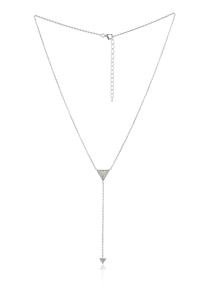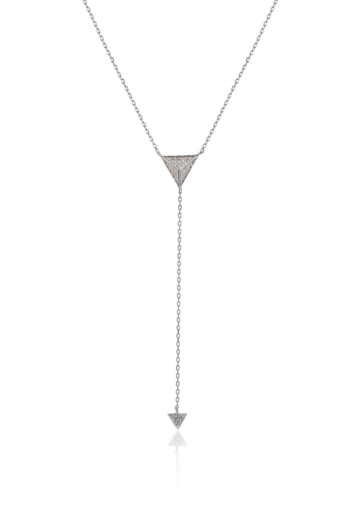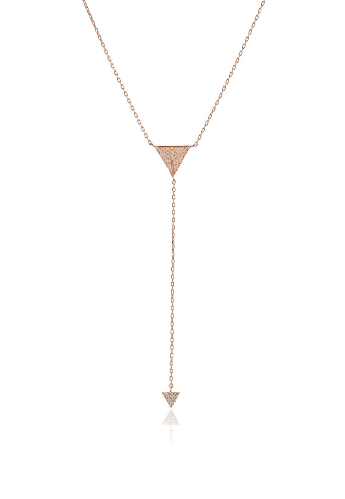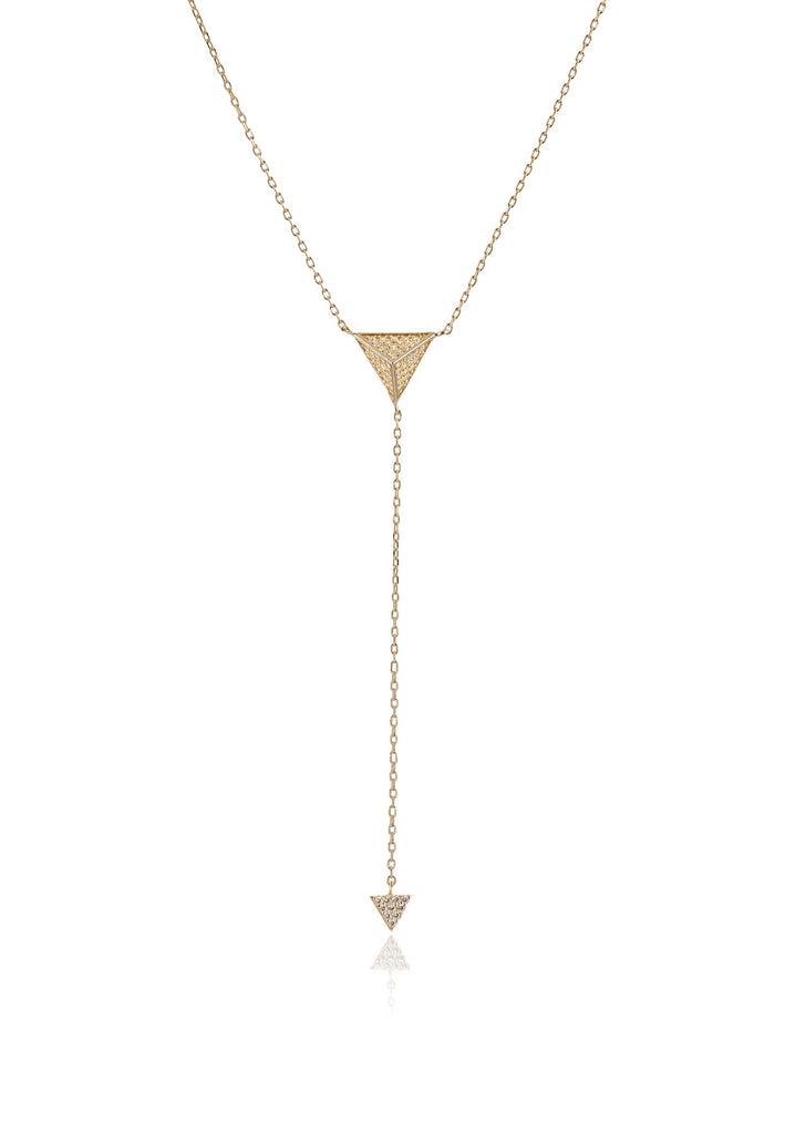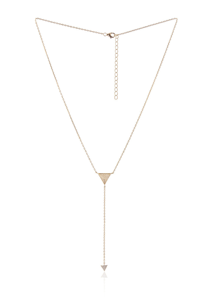 Layer up with this minimalist triangle lariat necklace. Punctuated by a single pyramid, the lariat style hangs low in a "y" shape.