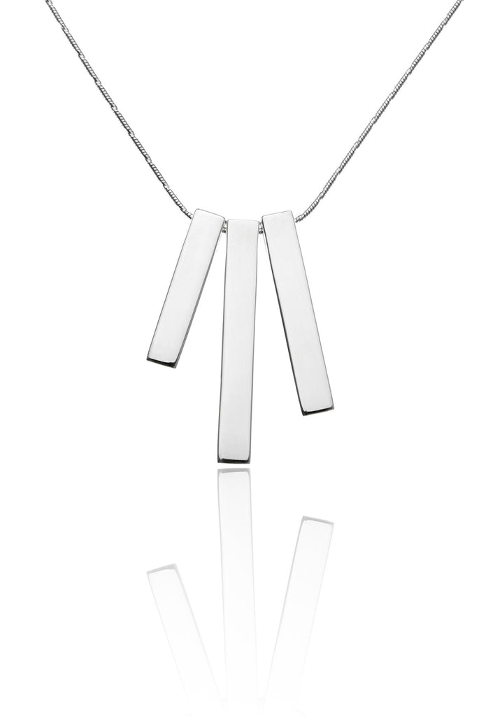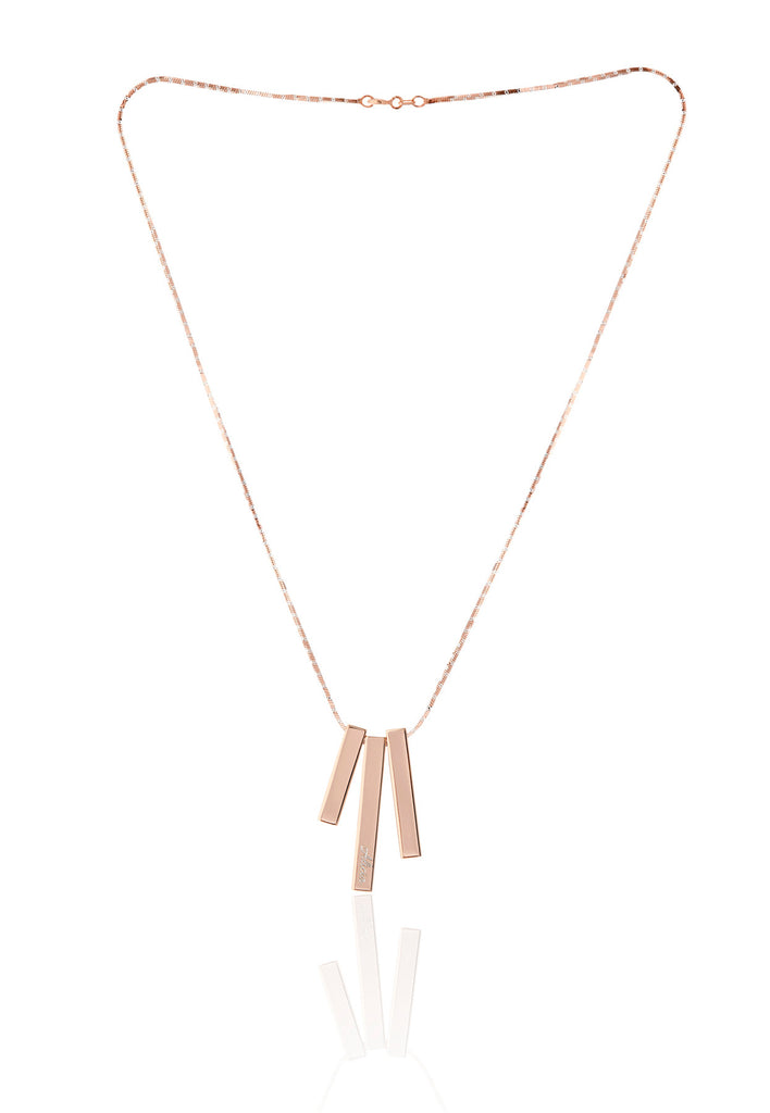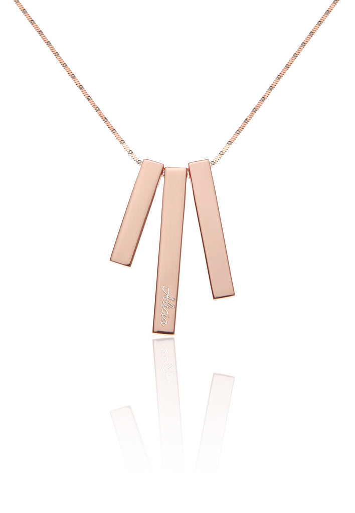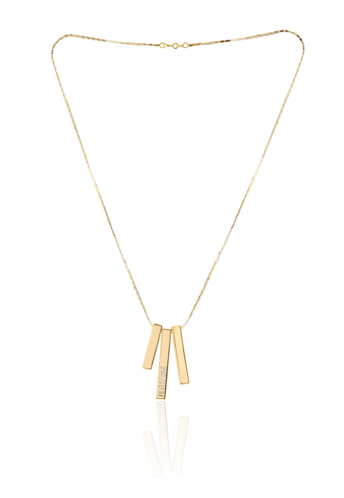 Personalize your look with this architectural bar necklace, embellished with three rectangular shapes. The three bars are different lengths, for an asymmetrical look, and each one can be engraved with a letter, word, or phrase up to 10 characters long. Or leave yours plain and simple, as it already makes a statement all on its own.