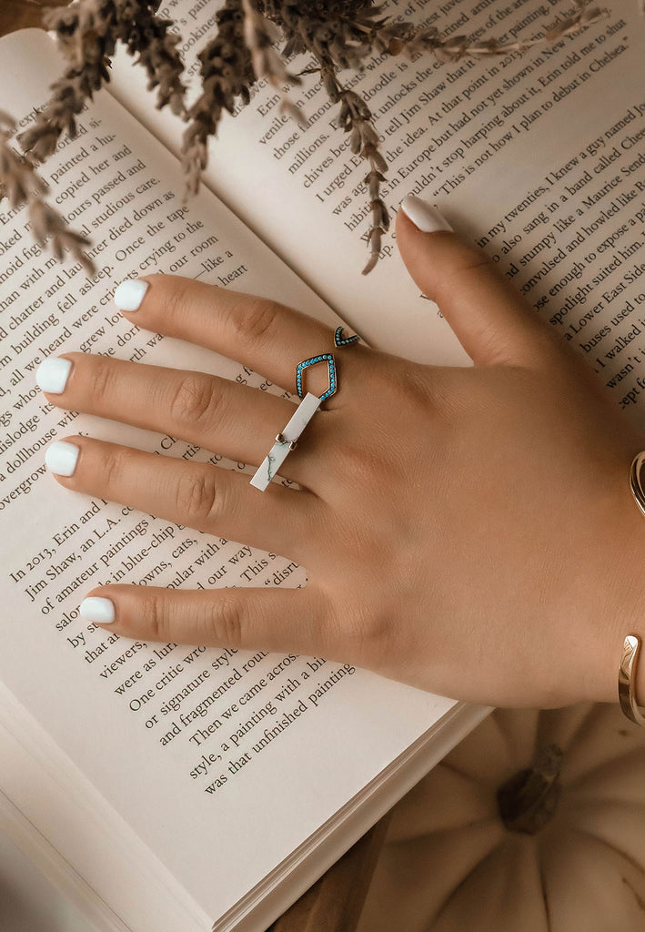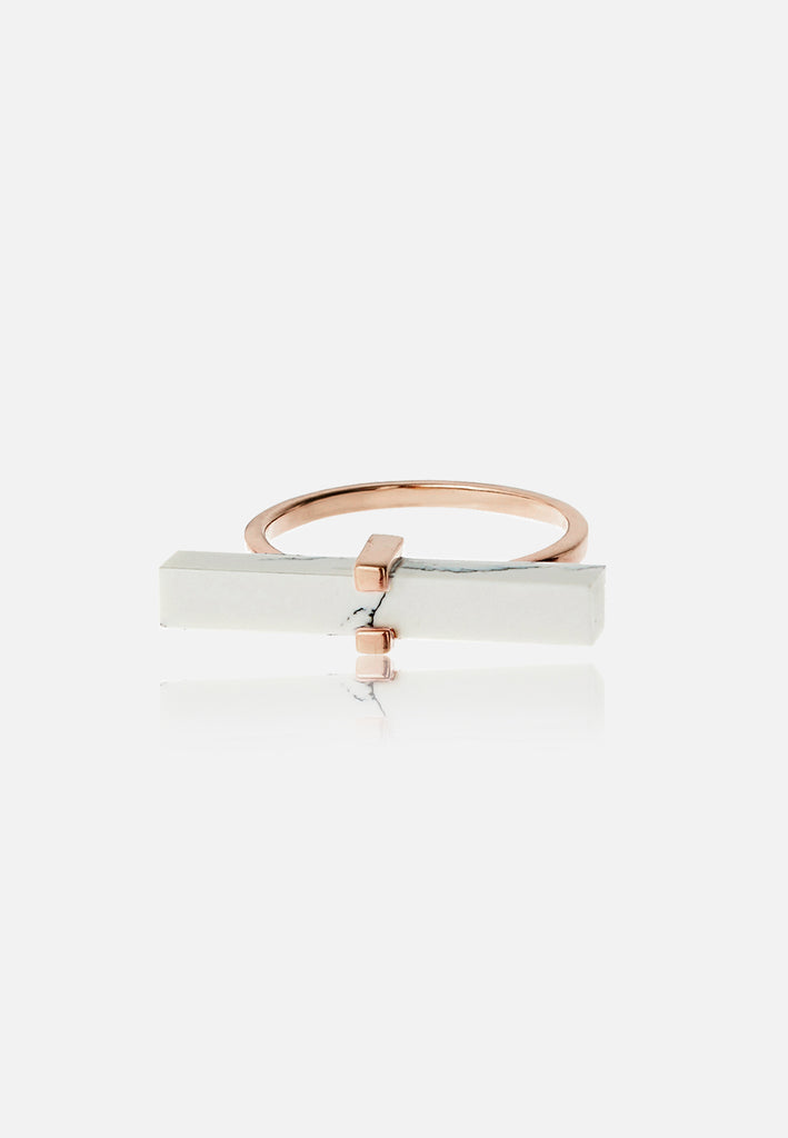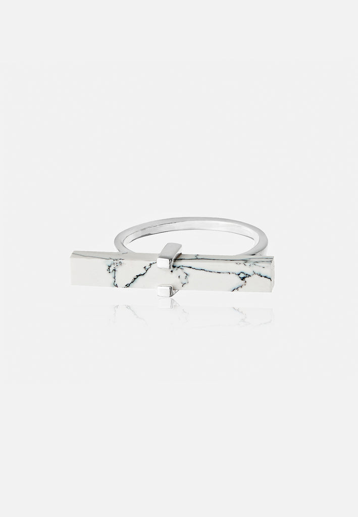 Adorn your hand with the healing, mystical powers of natural howlite. In this ring, a narrow pillar of howlite is nested in a simple geometric setting on a thin band. Since it's fastened in the center, the stone in its full glory is visible when worn on the finger.